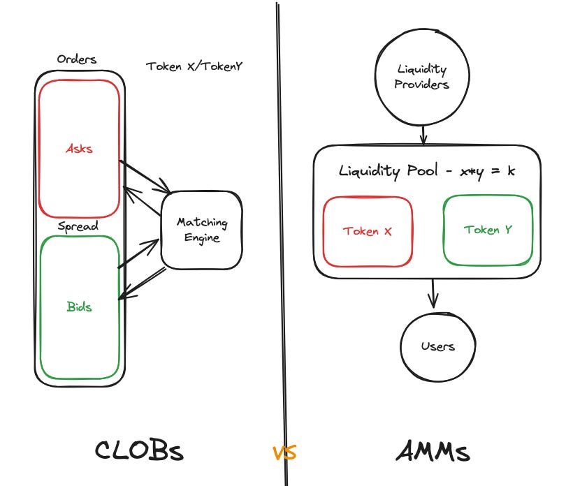 For years, AMMs like Uniswap and Orca have been the backbone of DeFi, with their algorithmic approach making them easy to design and deploy onchain. But they come with trade-offs like higher fees, poor price discovery, and increased slippage. Now, CLOBs - the gold standard in traditional finance - are gaining traction onchain. Unlike AMMs, CLOBs let traders place custom buy and sell orders at specific prices, enabling more efficient and transparent markets.