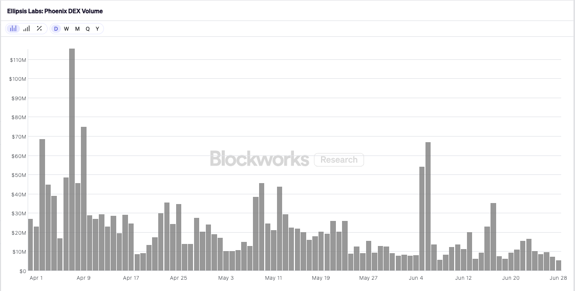 In late 2023, Ellipsis Labs announced Phoenix - a CLOB DEX that improved on Serum by achieving instant, atomic trade settlement without offchain cranking. Its architecture consolidates the orderbook, matching engine and trader balances into a single market account using efficient in-memory data structures. Its design minimizes account inputs, reduces compute usage, and achieves high throughput with subsecond finality. Phoenix primarily runs SOL/USDC and SOL/USDT pairs and even reached a daily volume peak of ~$1.2B early last year.